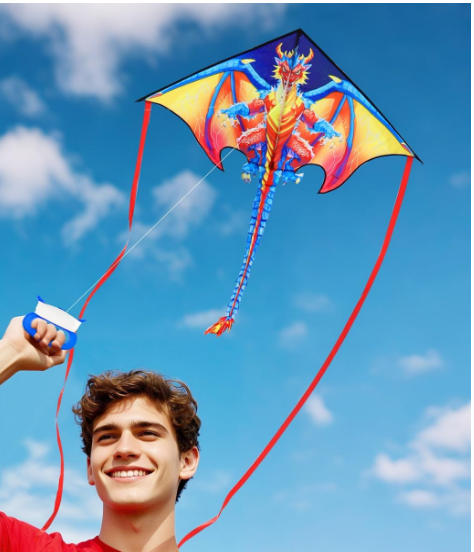 - Breathtaking Dragon Design & Ultra-Bright Colors Soar with a vibrant, eye-catching dragon kite designed with vivid UV-resistant prints that glow in sunlight. Its dynamic dragon shape and bold colors (red, blue, gold) dominate the sky, perfect for festivals, beach days, or backyard adventures.