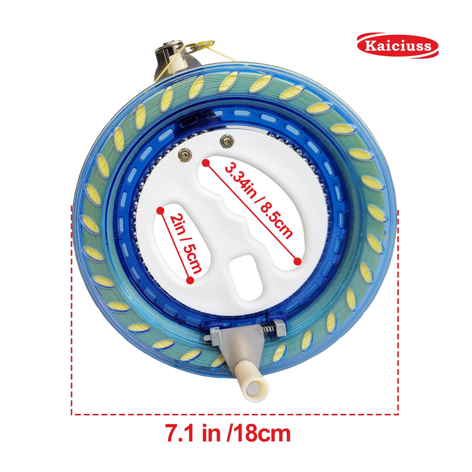 - 7.1’’ Kite Reel Winder for Kids & Adults. Each kite wheel comes with 650 ft of kite line and is equipped with high speed steel bearings to make take-up and release easier. Humanized safety lock design, stops when locked, prevents inverted rotation causing accidental injury, and also frees your hands. Note: This kite reel is suitable for flying kites of 1.8 meters and below, if the kite size is more than 1.8 meters, it is recommended to replace the kite spool with a larger size.