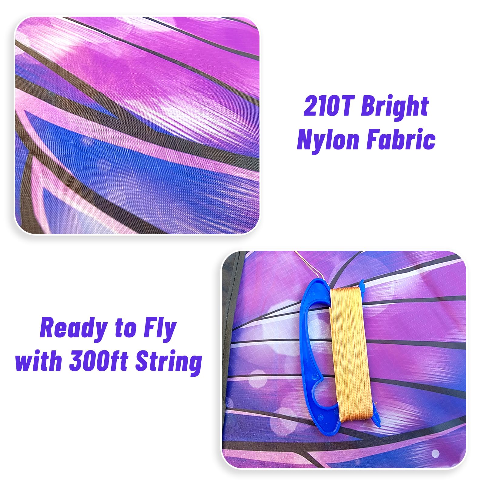 - Large Size & Beautiful Design Butterfly Kite Sized 55″ x 28″ with 4 purple tails each side, an easy grip kite string handle with 300ft line. It’s quite pretty with vibrant purple color, flapping its wings like a real butterfly in the sky. Both kids and adults can handle it easily.