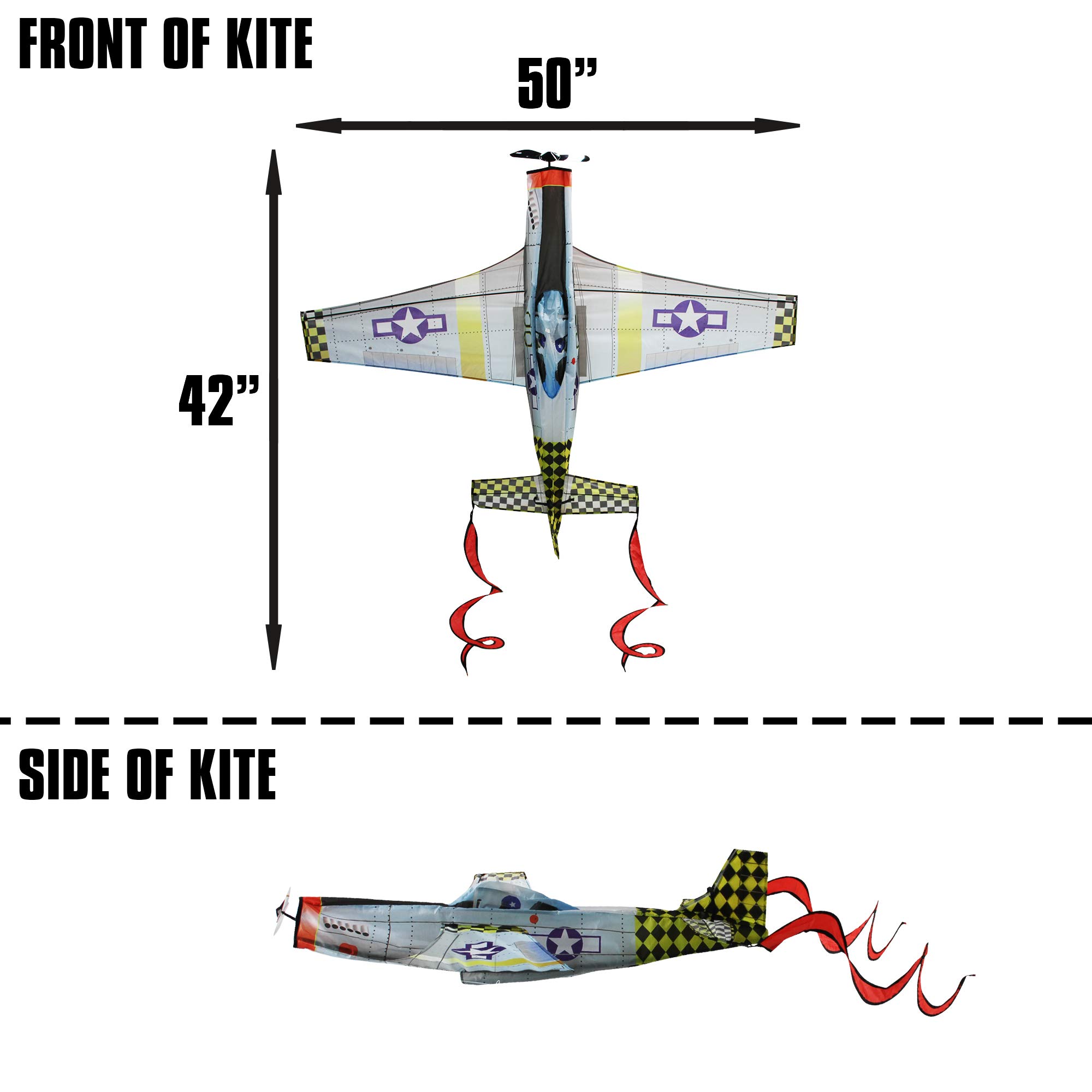 The Jumbo Jet kite is a super-sized blast to fly! An oversized (50-inch span) 3-D kite, with handle and line included, this one is sure to draw envious looks from other kite flyers at the park or beach. It’s made of Rip Stop fabric for durability, and includes everything you need to get flying!;From the Manufacturer; This Super Size P-51 Mustang Kite has wingspan of 50 inches and is ready to fly. The 3-dimensional kite is made of durable nylon and has fiberglass airframe.